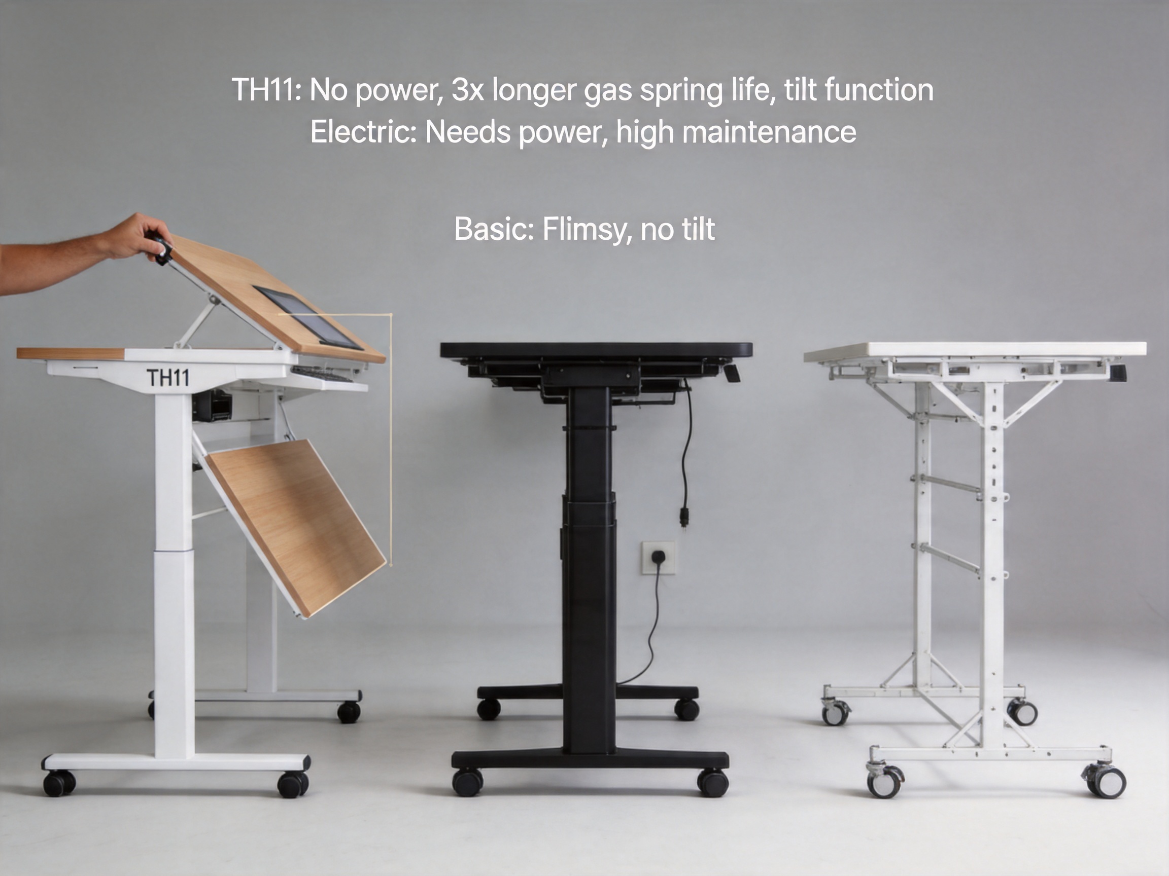 To understand the TH11’s value, it’s essential to compare it to the most common alternatives on the market: electric adjustable desks, basic pneumatic desks, and fixed desks. Below is a detailed comparison table: