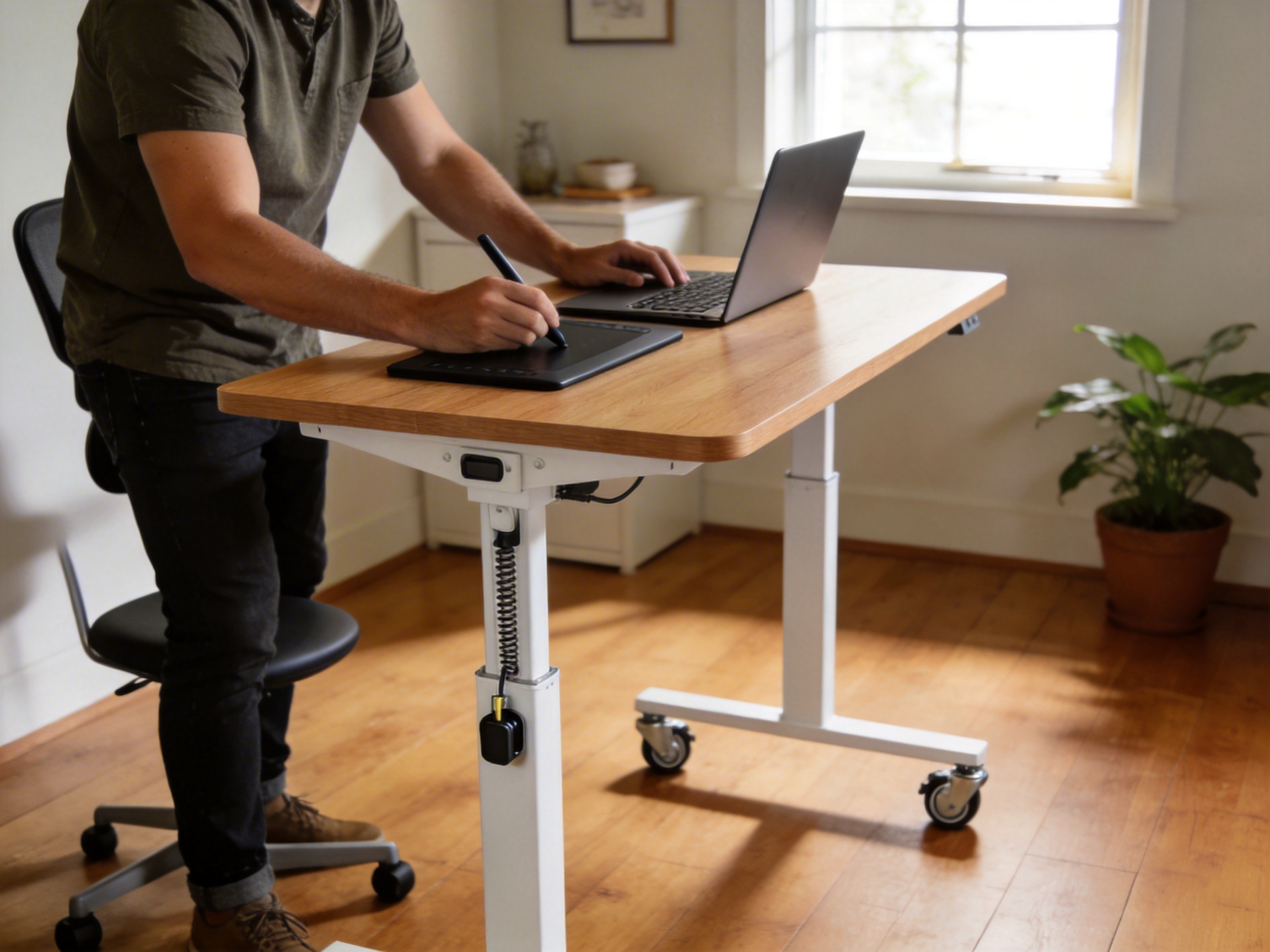 No Power Required: Electric desks need to be plugged into a power outlet, limiting their placement to areas with access to electricity. The TH07 is cordless, so it can be used anywhere—whether in a home office without nearby outlets, a studio, or even an outdoor workspace (weather permitting).