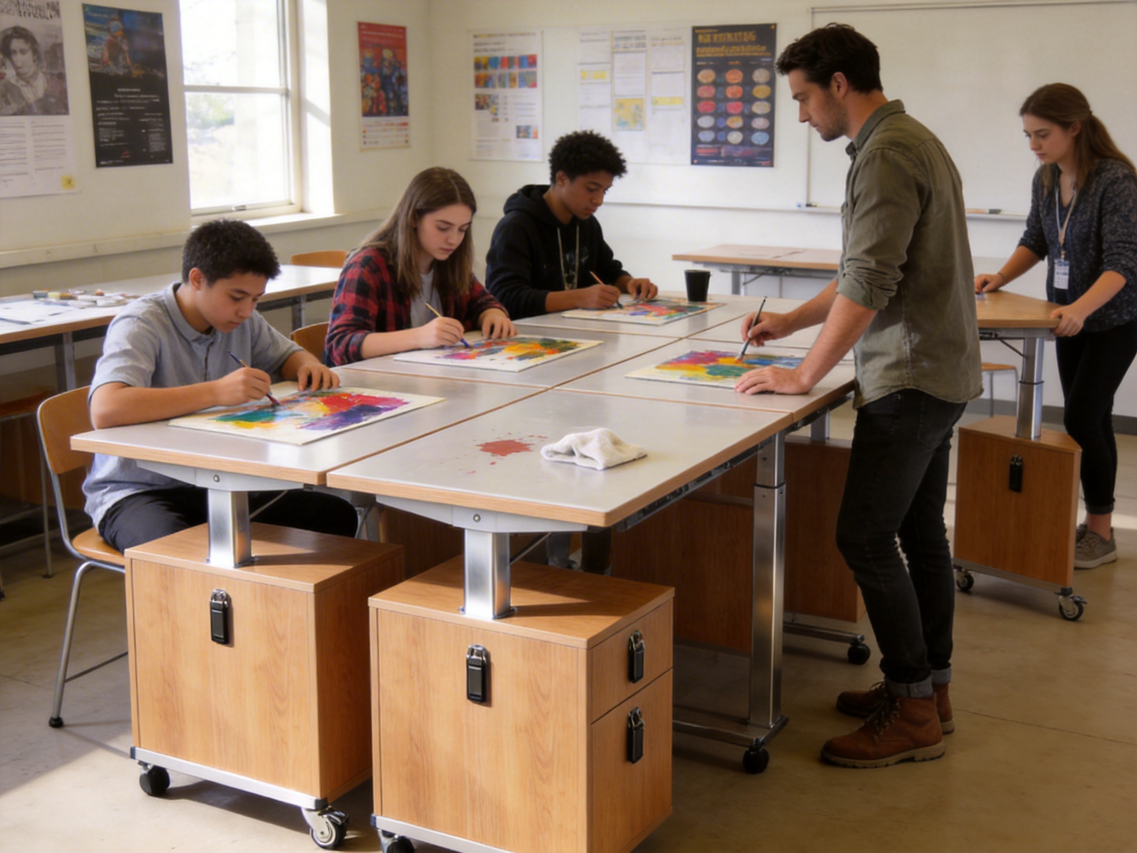 Testimonial from a high school teacher: “I teach art and need desks that can handle messy projects and different student heights. The TH12’s PVC tabletop wipes clean in seconds—even acrylic paint comes off easily. The adjustable height means my 14-year-old students (who range from 4ft 10in to 6ft) can all work comfortably. The lockable casters let me rearrange the desks into groups for group projects, which has made my lessons more engaging. The desks are also very durable—they’ve survived two years of student use without any damage.”