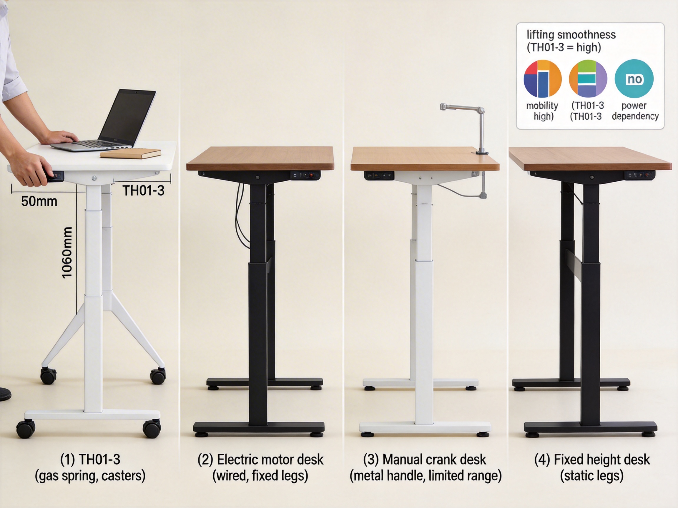 | Feature | TH01-3 Pneumatic Desk | Electric Linear Actuator Desk | Manual Crank Desk | Fixed Height Desk |