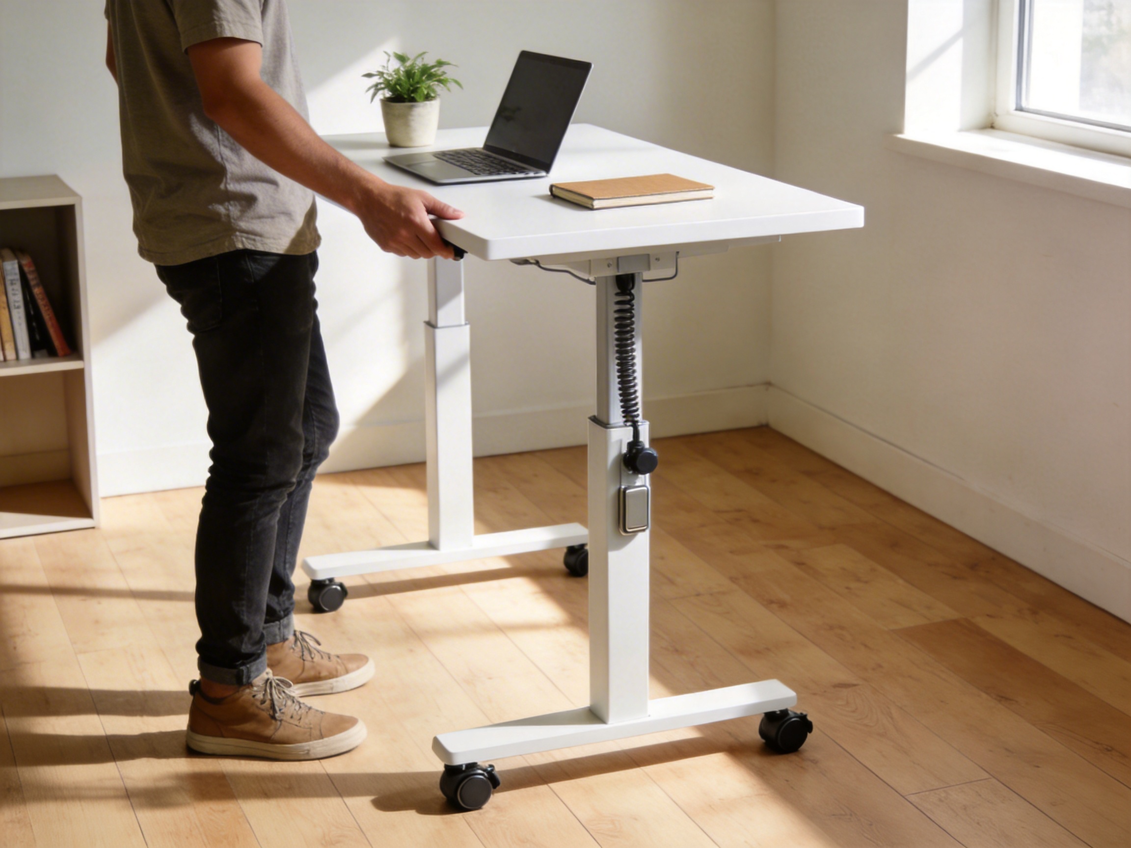 Two main types of standing desks dominate the market: electric and pneumatic. Each has its own set of pros and cons, but the TH-13’s pneumatic design offers distinct advantages that set it apart. Electric desks use motors to adjust height, which allows for precise, push-button control. However, they require a power source, are often heavier and bulkier, and have higher maintenance costs due to motor wear and tear. Pneumatic desks, on the other hand, use gas springs to facilitate height adjustment, eliminating the need for electricity. They are lighter, more compact, and require minimal maintenance, making them ideal for users who prioritize portability and simplicity.
